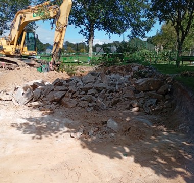 Du côté de Launain, le brise roche hydraulique est à l’œuvre pour la création du bassin de rétention d’eau du futur parking